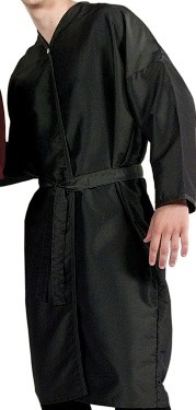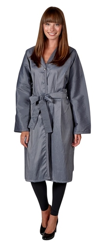 Like your favorite pair of jeans the "Original Dream Cape" was designed in the perfect extra-large size and length, with a full coverage back flap and round snap neck to create a flat space for cutting, and sewn in the perfect silky fabric in your favorite color. Classic Zip-On Smock was the original client gown, designed for a salon in Beverly Hills, with zips at shoulders opening fully for ease in removing and smooth surface for cutting.