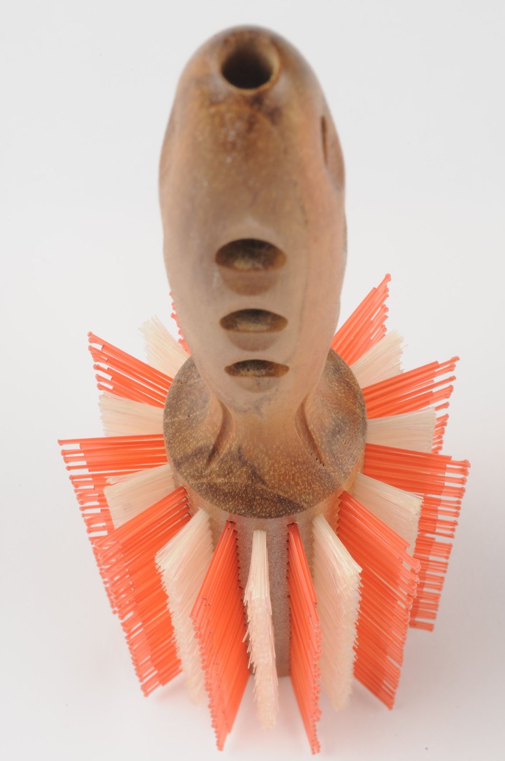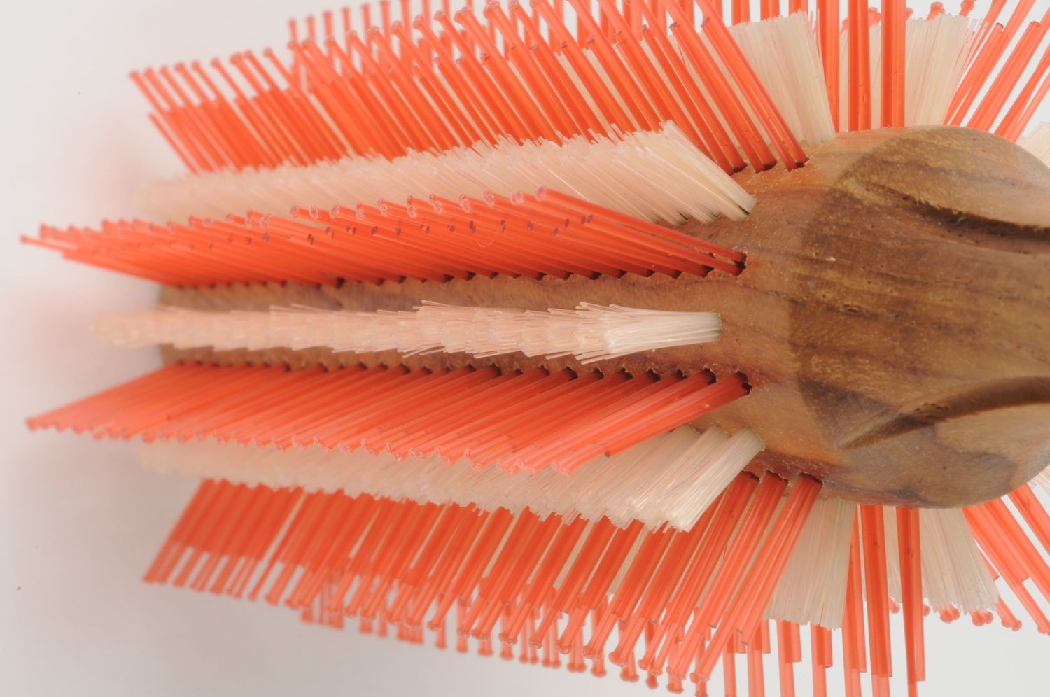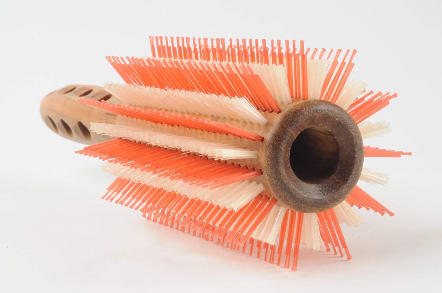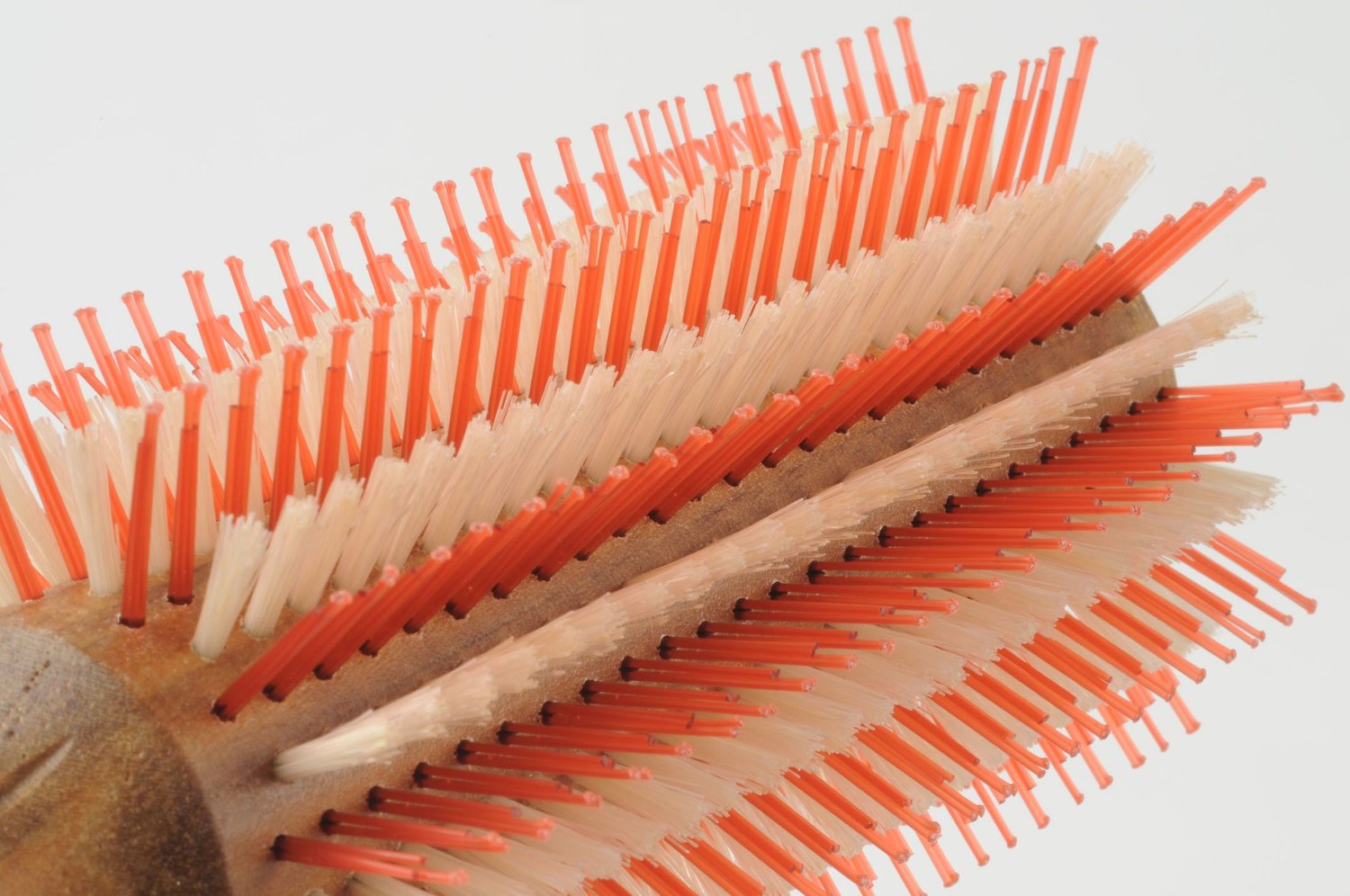 The long heat resistant polyamide pins (orange) smoothly grab and lustrously straighten the hair while the short boar bristles (white) create gleaming curls resulting in a finish incomparable to any other.